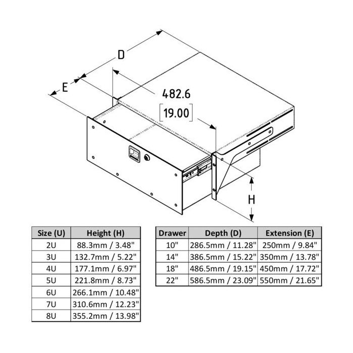 Eén rack unit (1U) heeft een hoogte van 44,45 mm, waardoor een 2U rack drawer bijvoorbeeld ongeveer 88,9 mm hoog is.