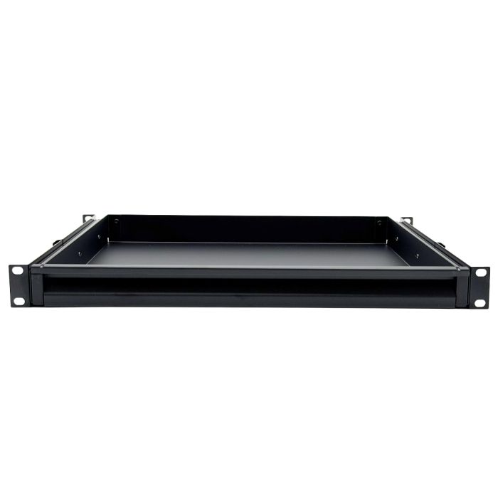 Professionele 2U uitschuifbare 19″ keyboard tray met zwarte framering. Ideaal voor rackcases, server- en AV-racks waar een toetsenbord soepel uitgetrokken moet worden.